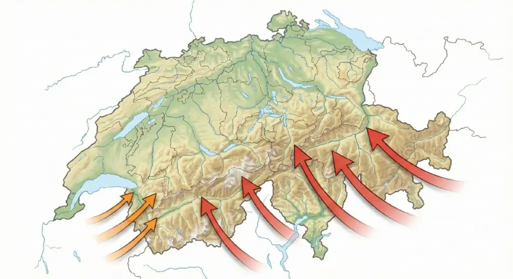 L’axe des Alpes Suisses n’est pas droit. L’orientation du vent est cruciale :