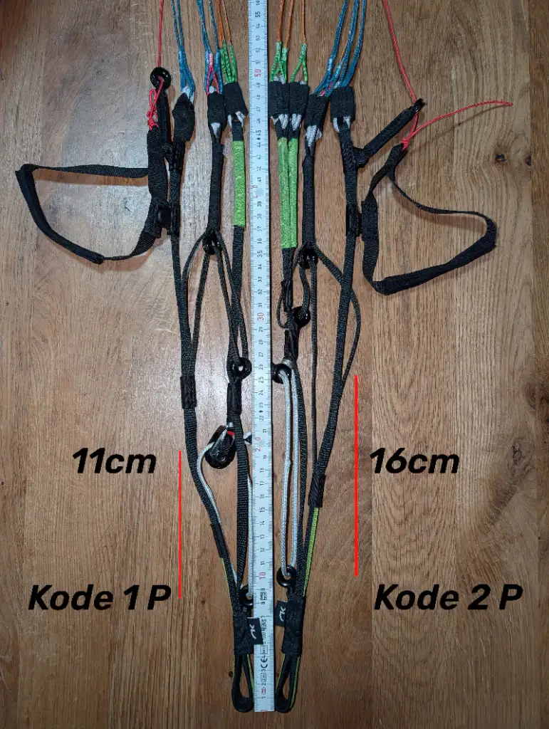 Le code couleur est limpide : élévateurs verts/suspentes oranges pour les A, élévateurs noirs/suspentes bleues pour le reste.